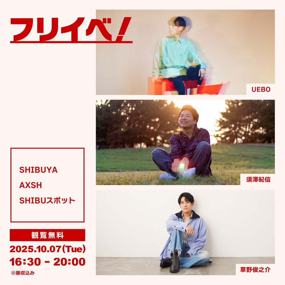 [東京]【フリーライブ】 フリイベ! SCHEDULE 2025/10/07(火) 16:30 - SHIBUYA AXSH SHIBUスポット 2025.10.07 (Tue) 「フリイベ!」 会場 : SHIBUYA AXSH SHIBUスポット 出演 : UEBO / 須澤紀信 / 草野俊之介 時間 : 16:30-20:00 *草野俊之介の出番は18:30〜を予定しています。 観覧無料 URLをコピーする 報告する